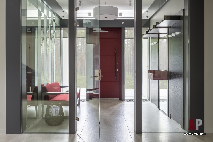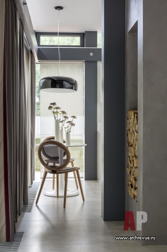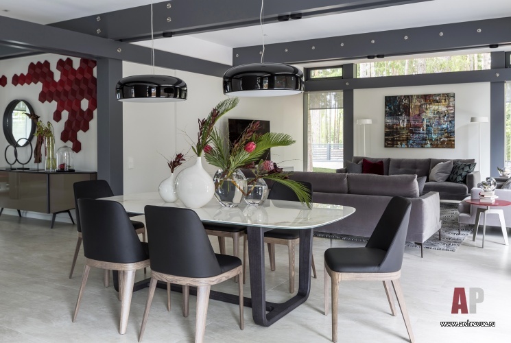За основу дизайн-проекта был взят конструктив дома с открытой балочной структурой. Балки выкрасили в серый цвет, стены в общих помещениях на контрасте декорировали светлой матовой краской, приватных – обоями с геометрическим рисунком. Мебель и ткани выбрали приглушенных тонов, с мягкой натуральной текстурой. С припыленными серыми тканями гармонируют ярко-красные акценты: банкета в прихожей, гипсовое панно в виде пчелиных сот в холле, вазы в гостиной, мебель в санузлах. Изначально существовало ограничение по бюджету, поэтому были намечены ряд итальянских фабрик, из которых и был составлен интерьер. Важную роль играет световое решение: чтобы создать разные сценарии, дизайнер использовала возможности скрытой и контурной подсветки. Невидимые глазу лампы установлены в верхней части потолочных балок обращены на потолок и дают комфротный рассеянный свет.