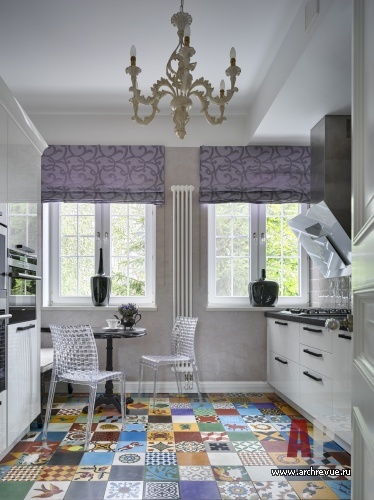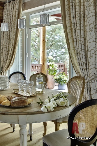 Вместо камина установлена печь, украшенная рельефными изразцами, она вносит в интерьер некую патриархальность, верность традициям. Эту же тему продолжает оформление столовой группы: обеденный стол был привезен с блошиного рынка Италии, люстру купили на острове Мурано, стулья и комоды с налетом старины подобрали в Москве. Природные материалы, теплые, шероховатые фактуры, старинная мебель – микс классики и кантри – служат прекрасным фоном для неспешной жизни на природе. Яркие цветовые акценты, венецианская штукатурка, средиземноморская керамика, картины по мотивам средневековых фресок из замка Манта и миниатюр из Манесского кодекса наминают о тихих итальянских городах с виллами у моря.
