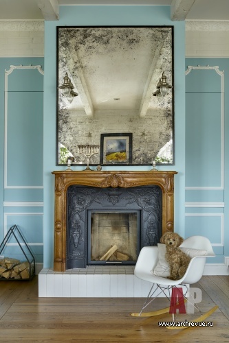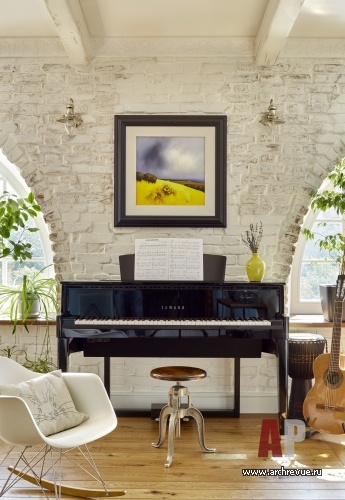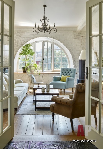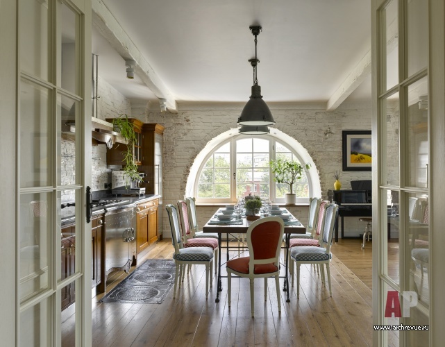 «За основу мы взяли образ современного английского интерьера, в котором гармонично уживаются изделия и аксессуары разных стилей и эпох, - рассказывает Ирина. – Прежде всего открыли историческую кирпичную кладку. К сожалению, она плохо сохранилась, но мы купили максимально аутентичный кирпич и покрасили стены в белый лессировочный цвет. Неравномерная покраска создает ощущение того, что интерьеру уже не один десяток лет». Двери, лестница, обеденный стол и значительная часть других предметов были созданы на заказ по эскизам дизайнера. Антикварный чугунный камин был отреставрирован и дополнен современной топкой. Светильники, дизайнерская мебель, аксессуары собраны поштучно, в разных местах.