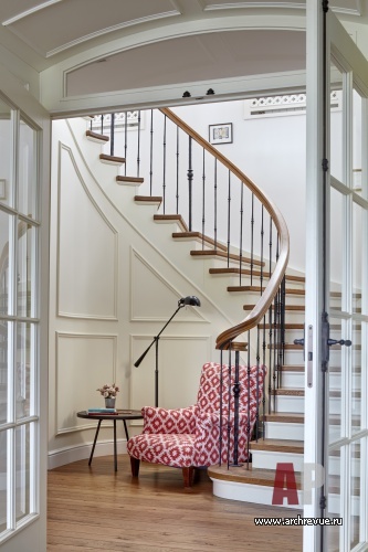 Лестничный холл кресло антикварное, перетянуто тканью Manuel Canovas, столик NEXXT