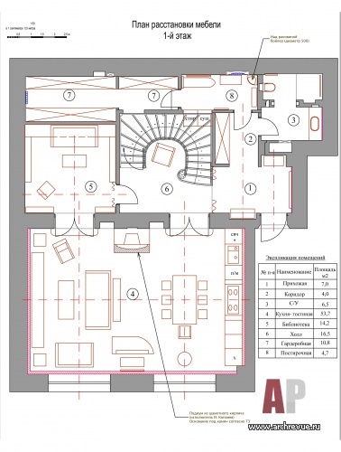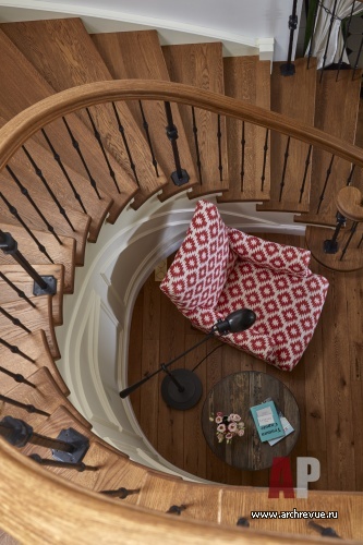 Двухэтажная квартира имеет функциональную планировку: половину нижнего этажа занимает просторная гостиная, объединенная с кухней и столовой. Ее украшают полукруглые окна, которые дизайнер оснастила современными немецкими стеклопакетами. На одной оси со столовой группой расположен парадный лестничный холл с винтовой лестницей, созданной по эскизам автора проекта. Также в глубине пространства располагается библиотека, гардеробная, постирочная и входная зона.