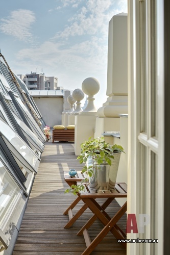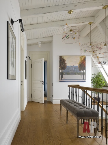 Верхний, мансардный этаж занимают приватные помещения: спальни, ванные комнаты, санузлы, будуар хозяйки. Они имеют мансардное остекление, из холла организован выход на открытую террасу с видом на город.