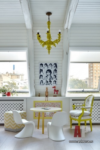 Семья с двумя детьми приобрела двухуровневую квартиру на последнем этаже в доме на Саввинской набережной, в начале 2000-х годов дом был надстроен, и новым хозяевам досталось роскошное пространство с мансардой и открытой террасой. Когда заказчики обратились к дизайнеру Ирине Бдайциевой, они уже попробовали поработать с другими архитекторами, но результат их не устроил. Изначально они хотели яркую квартиру, в которой бы жил дух свободы и творчества.