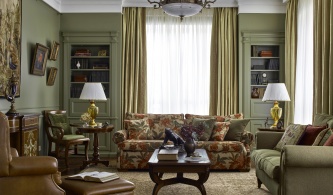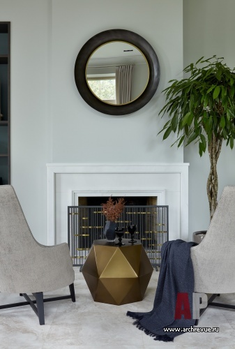 Зона отдыха в цокольном этаже журнальный столик Eichholtz, диван и кресло Furman