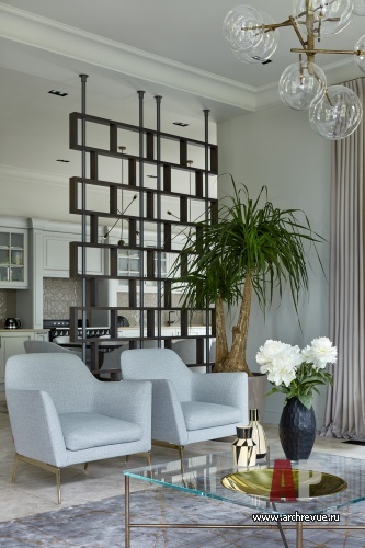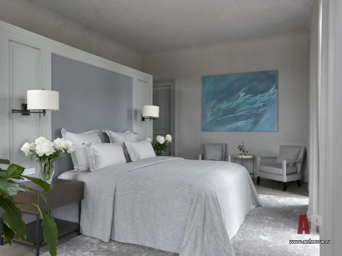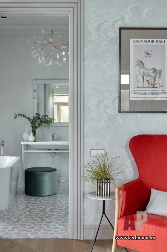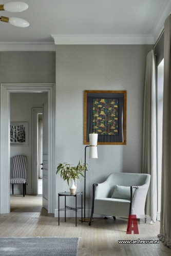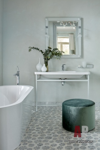 Отправной точкой в поисках декоративного решения стали интерьерные вырезки из журналов, который принес с собой заказчик. «Так получилось, что на всех них были проекты с серо-голубыми интерьерами Жана-Луи Денио. Эти светлые, наполненные воздухом и гармонией с природой интерьеры стали для нас источником вдохновения», - отмечают Алена Нагаева и Елена Минчева.
