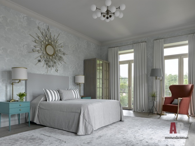 Спальня кровать, прикроватные тумбочки сделаны на заказ, кресла Eichholtz