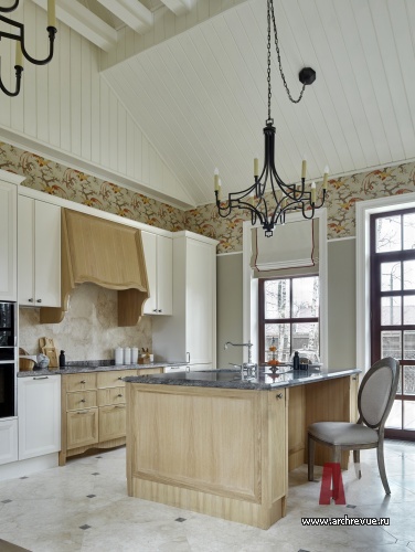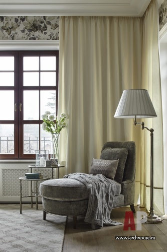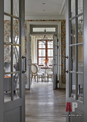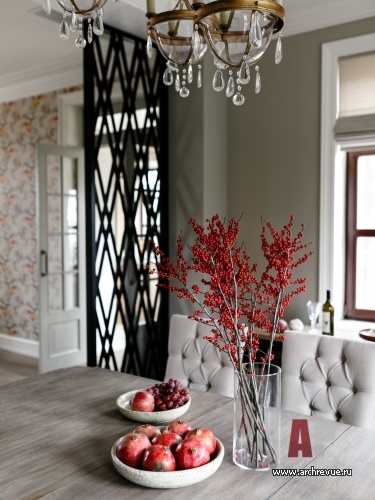 Черный цвет авторы проекты смягчают теплыми оттенками серого, молочного, голубого и рябиново-красного. Чтобы подчеркнуть, что дом находится за городом, в природном окружении, они используют много натурального дерева, особенно светлого, выбеленного дуба с состаренной фактурой. Зеркальные поверхности, латунь, обои с серебристым рисунком, дающие легкое мерцание, ткани с легким блеском подчеркивают легкость и воздушность интерьера. Мебель и декор дополняют декоративный ряд, дают ощущение покоя, семейного тепла и уюта.