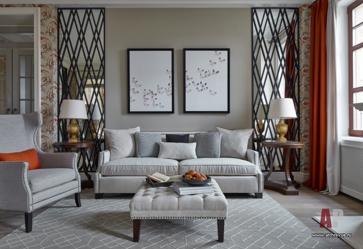 Гостиная серые кресла, диван Bernhardt, пуф-столик LeHome, красное кресло Caracole, столик Hooker
