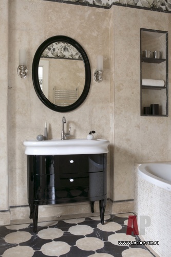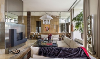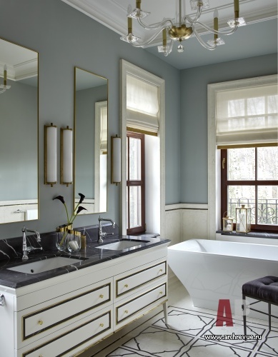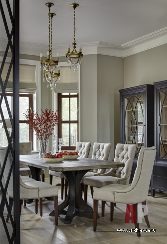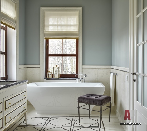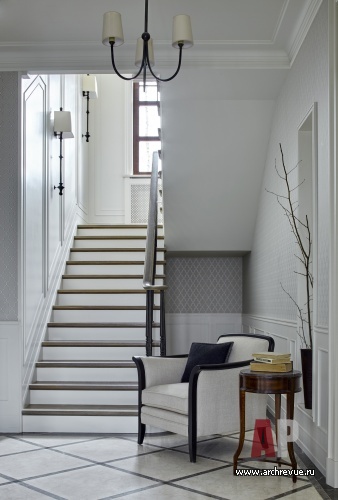 Сами авторы определяют стилистику интерьера как обитаемую классику в современном прочтении, с отголосками традиционных американских интерьеров. Отчасти дом выглядит строгим и графичным: четкая геометрия линий, которая прослеживается в оконных переплетах, в отделке мебели и декоративных перегородках, в рисунке на коврах, мраморных плитах пола и настенных панелях. Но эта графика задает ритм, подчеркивает масштаб деталей, создает свой особый художественный ряд.