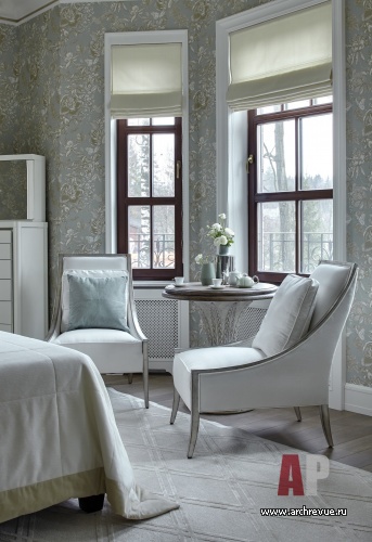 Спальня прикроватные столики, стол в эркере Hooker, комод, кресло Caracole, кровать Emerson Bentley, кресло и столик Bernhardt
