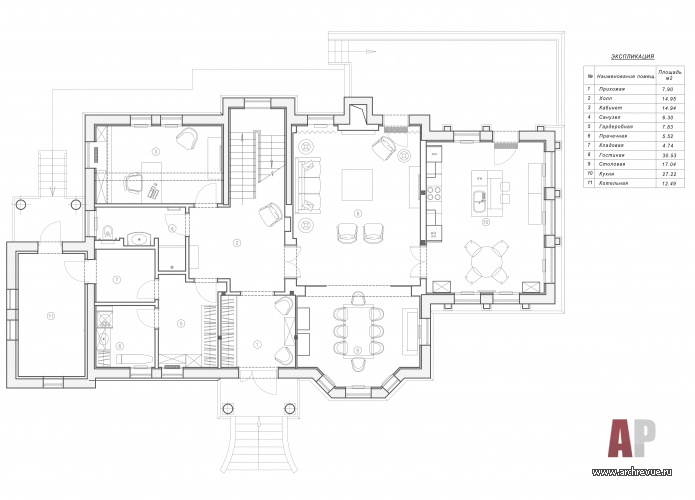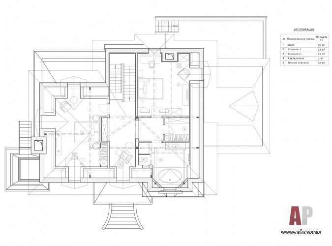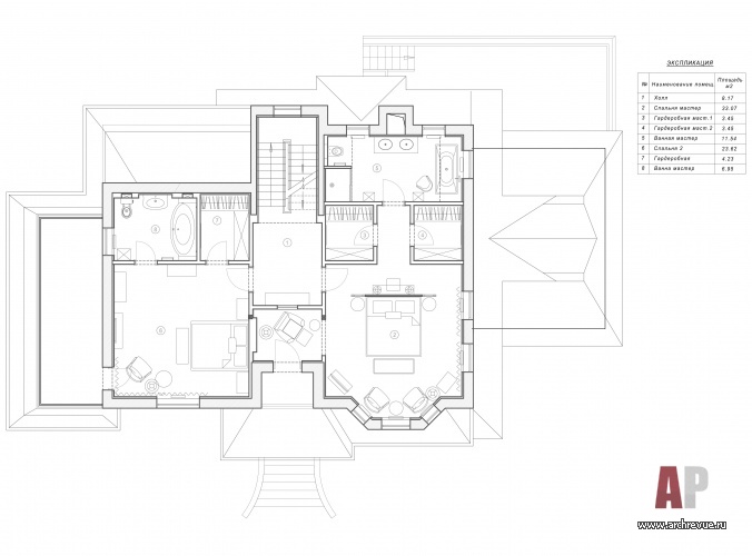 По другую строну от лестничного холла находится кабинет хозяина и технические помещения. Второй этаж занимают две просторные спальни со своими ванными комнатами и гардеробными. В мансарде организована зона отдыха с библиотекой, а также размещены две детские с гардеробной и санузлом. Из-за сильного скоса кровли дверь в одну из спален пришлось сильно понизить и замаскировать стеновыми панелями, обитыми тканью.