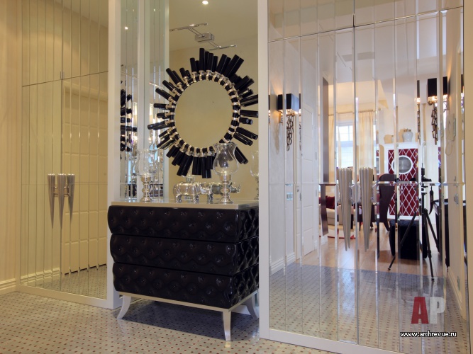 В качестве стилистики была выбрана актуальная европейская эклектика с трендовыми материалами и новинками мебельного дизайна. Стены гостиной и спальни декорированы панелями, обтянутыми натуральной кожей. Доминанта прихожей – шкафы с фасадами, набранными из фацетных, вертикально нарезанных зеркальных «плашек».