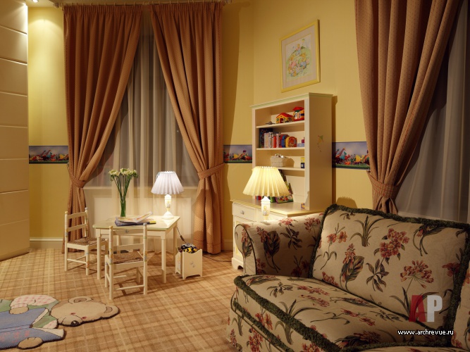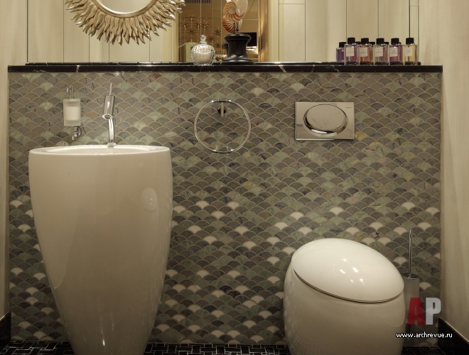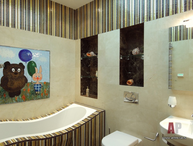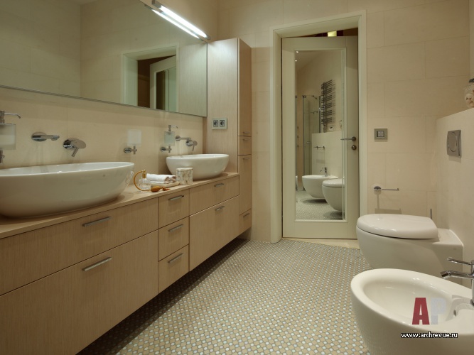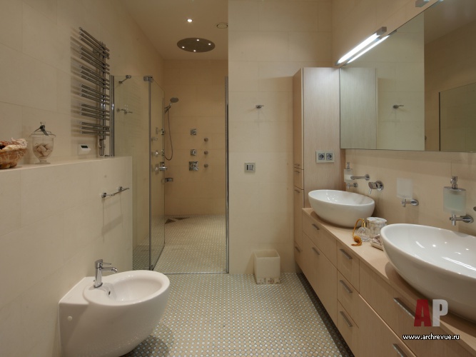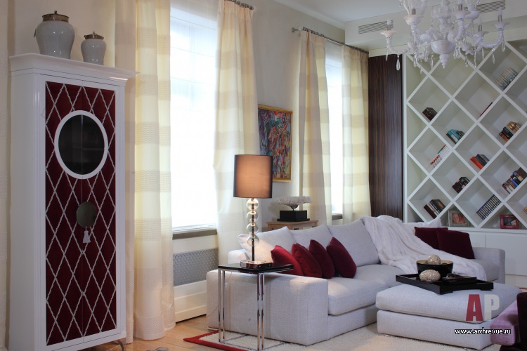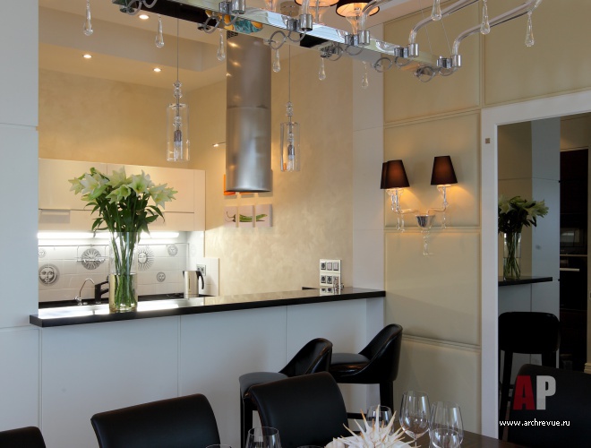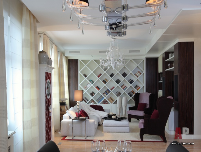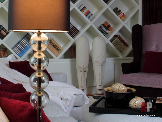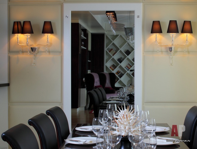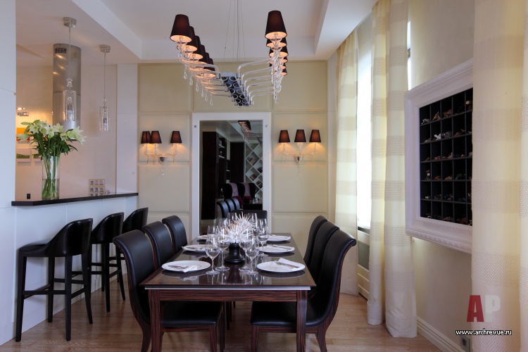 Ценные породы дерева, бежево-перламутровые отделки, глянцевые фактуры – все это создает образ актуального, продвинутого интерьера. Тенденции современного дизайна отчетливее всего прослеживаются в мебели, в том числе и созданной по эскизам авторов проекта. Среди них библиотечный стеллаж с отсеками-ромбами и необычайно красивый шкаф для посуды. Он обит бархатом и разработан специально под хозяйскую коллекцию фарфора.