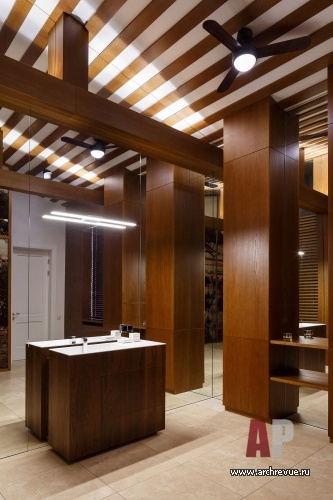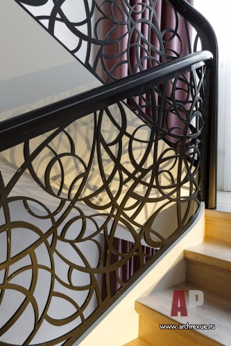 К парадным помещениям примыкает СПА-зона с бассейном, сауной, хаммамом и тренажерным залом. Верхний этаж отдан приватным помещениям. Хозяйская спальня окружена двумя ванными комнатами: светлой и романтичной женской и темной и брутальной мужской. Отельное место занимает зона отдыха, которая играет роль кабинета, будуара и каминного зала с уютными кушетками для вечернего отдыха.