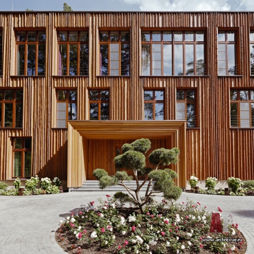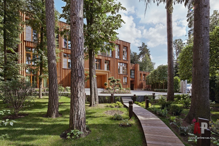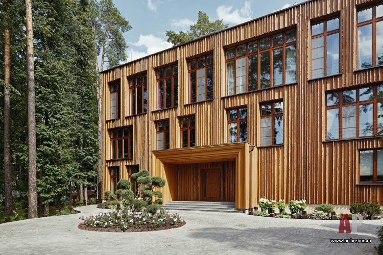 Монолитный особняк площадью 1500 кв. м возведен по проекту Светланы Писарской и Людмилы Митрофановой и отражает современное представление о доме с русским характером. Изначально он, как и большинство домов на Рублевке, предполагал внешнюю кирпичную отделку, но заказчик в последний момент предложил поэкспериментировать с деревом. Архитекторы с энтузиазмом развили тему: отделка выполнена оригинальным способом – разные по ширине обработанные доски лиственницы перемежаются с досками необрезными, горбылем, которые закреплены перпендикулярно плоскости стены.