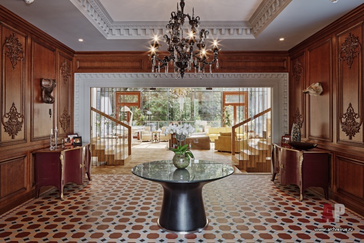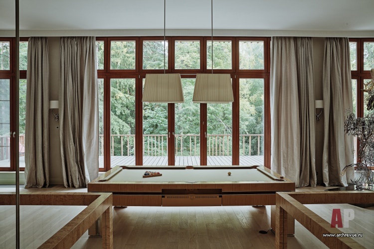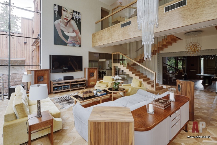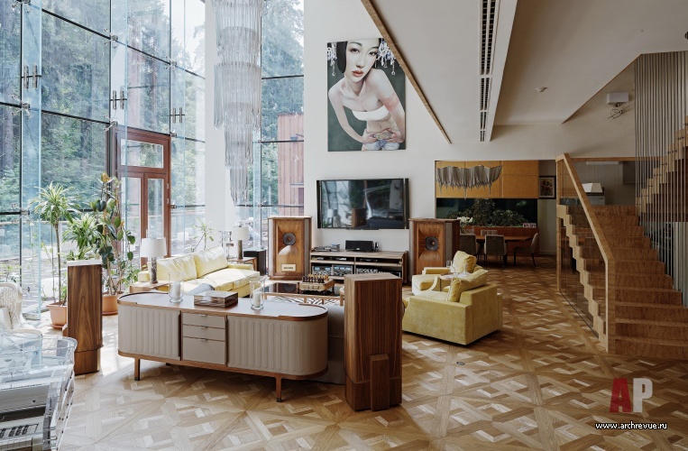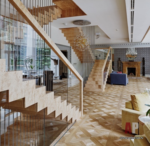 Сложный рисунок выкладывали по месту, чтобы не только правильно обрамить все углы и проемы, но и задать фасадам интересный ритм, в котором читаются палладианские традиции. Для разработки интерьеров были приглашены архитекторы Мария и Никита Бахаревы, которые развили тему деревянного зодчества и превратили дом в эпатажное пространство для произведений искусства.