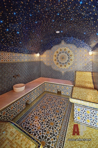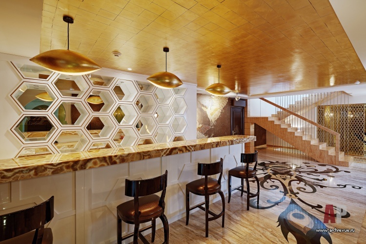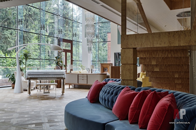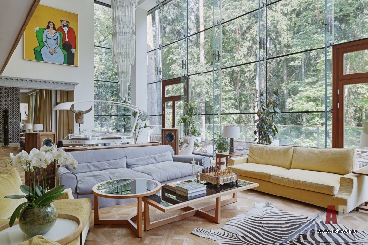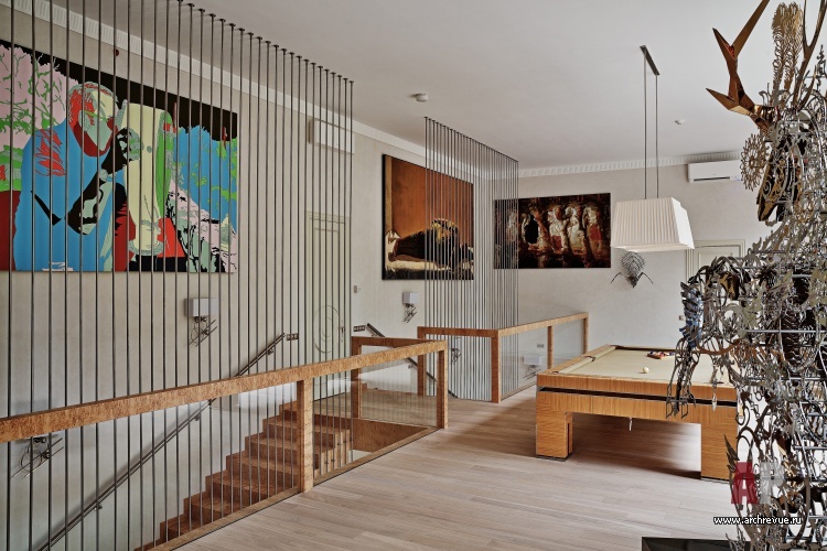 Заказчик – гедонист, путешественник и коллекционер современного искусства – задумал дом как эклектичное пространство: яркое, неординарное, эпатажное. Важную роль в нем играют предметы из обширной коллекции, они служат смысловыми векторами, которые «держат» декоративный ряд. Учитывая пожелания хозяина и нестандартную архитектуру дома, Мария и Никита Бахаревы создали интересный микс из английской классики, арабских мотивов и неорусского дизайна.