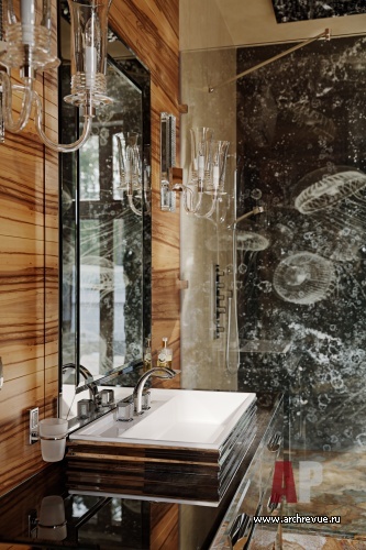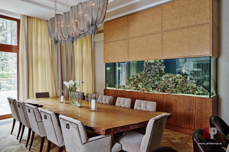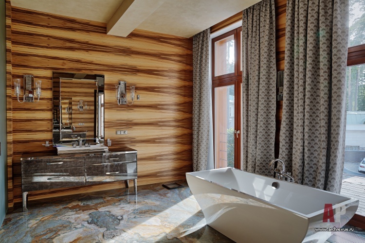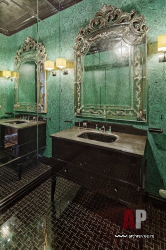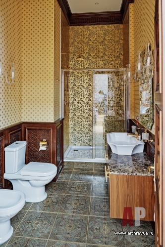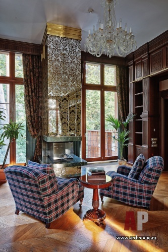 Русскую тему поддерживают характерные отделочные материалы: карельская береза, из которой изготовлена лестница, встроенная и корпусная мебель первого этажа и даже наборный художественный паркет, зеленые обои, имитирующие малахит, и изразцы с кобальтовой росписью в стиле петровской эпохи.
