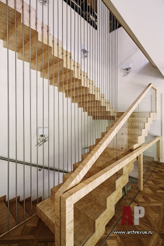 В общее пространство включен двухчастный лестничный марш, который соединяет три уровня дома: общественный этаж, верхние приватные помещения и СПА-зону, расположенную в цокольном этаже.