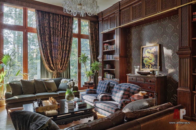 Гостиная диваны, кресла, журнальный столик Giorgetti, библиотечный стеллаж Besana