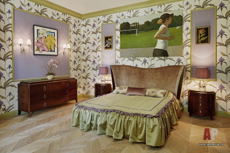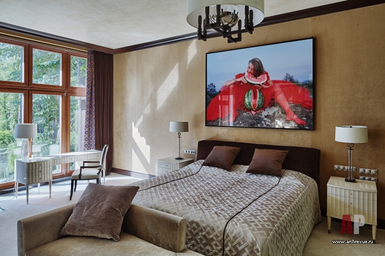 Спальня кровать Treca Interiors Paris, прикроватная тумбочка и стол Barbara Barry, козетка Flexform