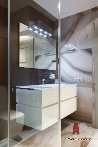 Интерьер выглядит по-мужски строго, элементы современного стиля в нем соединены с приметами классики: белыми филенчатыми дверями, традиционными люстрами, половой доской с фактурой зебрано. Индивидуальность квартире придают настенные авторские барельефы с изображением белоснежных орхидей.