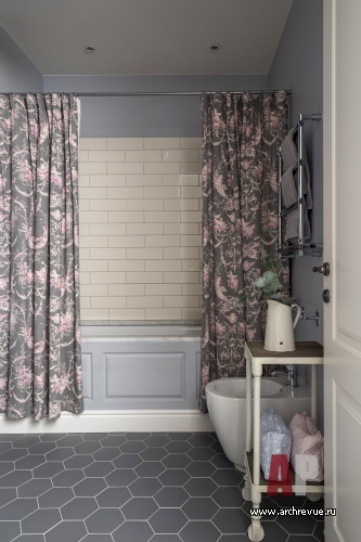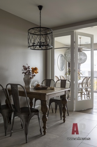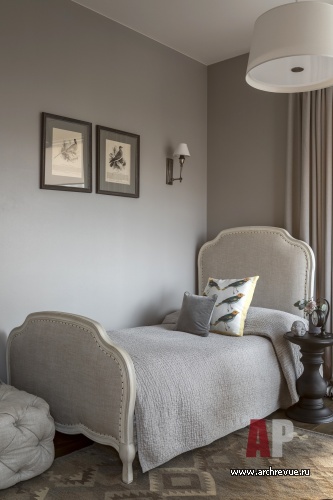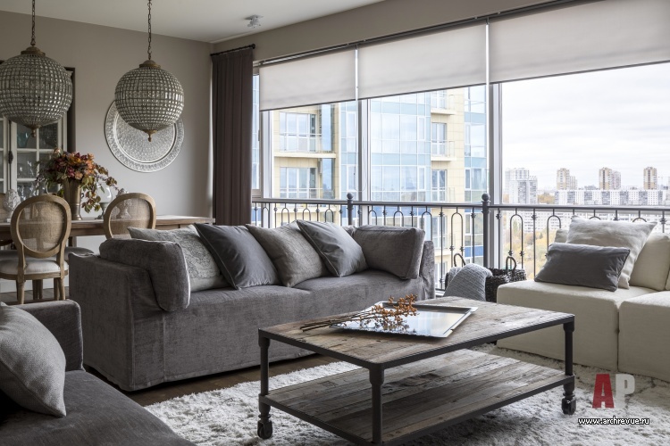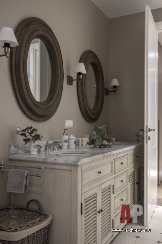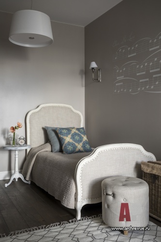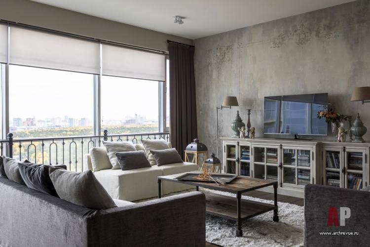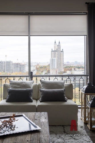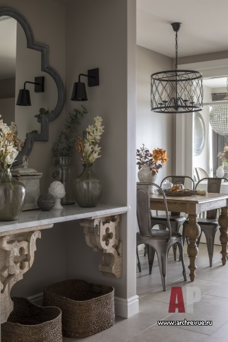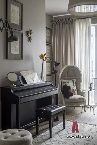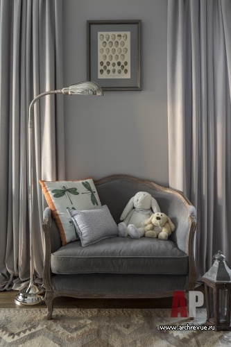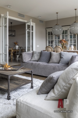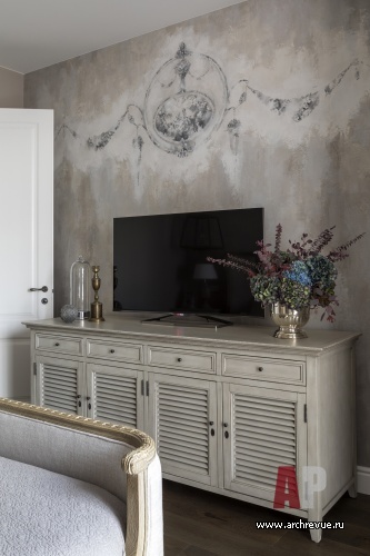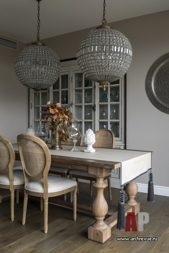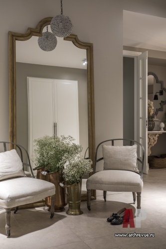 Полы в жилых помещениях выложены паркетом из состаренного дуба, на полу мокрых зон – плитка, имитирующая старую керамику. Стены во всех помещениях выкрашены в единый цвет, что дает иллюзию пространства без явных границ: этот прием подчеркивает большой объем квартиры. Основной декоративный акцент интерьера – художественная роспись, которая дает ощущение состаренной со временем поверхности с потертостями и живописными подтеками, какие можно увидеть лишь в старинных заброшенных особняках, где время остановилось… Мебель американской фабрики Restoration Hardware, светильники в стиле шебби-шик и подлинные винтажные предметы, которые дизайнер искала по всему миру, завершают образ современной квартиры с патиной времени.