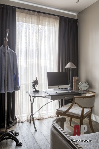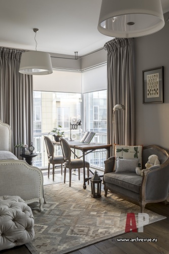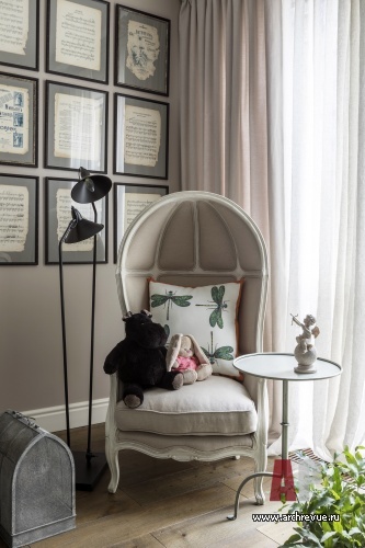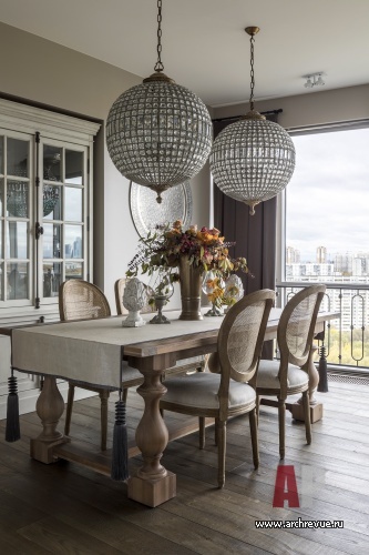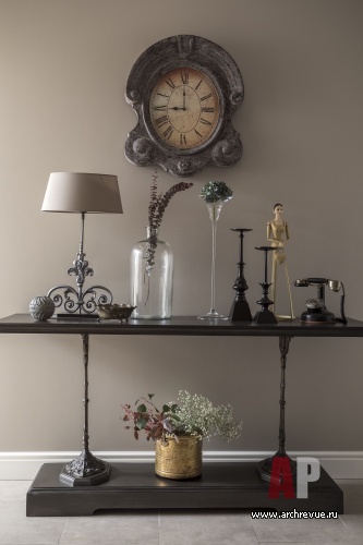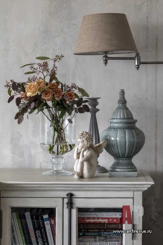 Дизайнер предложила пойти по пути неоклассической стилистики с атмосферой благородной старины, материалами с патиной времени и подлинными винтажными и антикварными предметами.