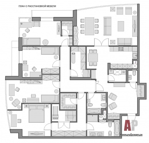 «Огромное преимущество квартиры – большие панорамные окна, – отмечает дизайнер. – Мне хотелось сохранить ощущение света и воздуха в интерьере, поэтому я предложила планировку, где окна работают на интерьер, начиная с коридора. Это же касается и кухни, которая не имеет окон, но благодаря стеклянной перегородке в гостиной прекрасно освещена». В целом, квартира разделена на две самостоятельные части: парадную и приватную, которая включает четыре спальни, три гардеробные, три санузла, холл и небольшую хозяйственную комнату. Особенно интересно решена хозяйская спальня, которая объединена с ванной и гардеробной в комфортные и просторные апартаменты. Обе детские имеют большие окна, дополнительная спальня оставлена как гостевая комната.