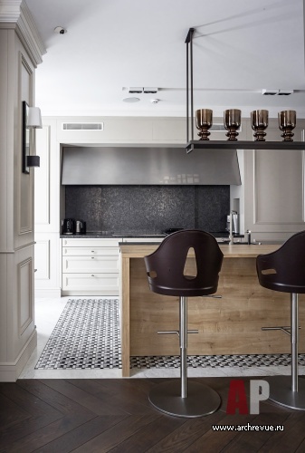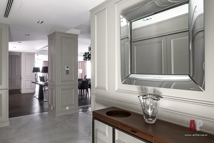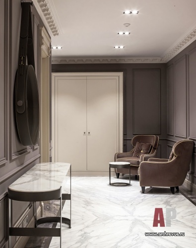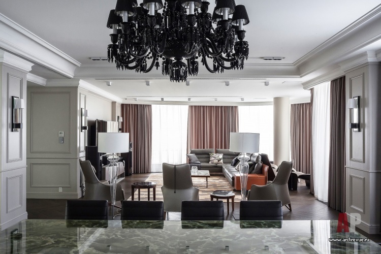 Поскольку квартира находится в историческом районе Москвы, близи Кремля и бульваров, то изначально они хотели получить классический интерьер. Однако после совместной с дизайнерами поездки на миланскую мебельную выставку, решили добавить в интерьер современную дизайнерскую мебель. В итоге получился микс из классики и современности, но, если обыкновенно дизайнеры используют современный фон и классические предметы, то авторы этого проекта пошли другим путем и на классическом фоне разыграли современный сценарий.