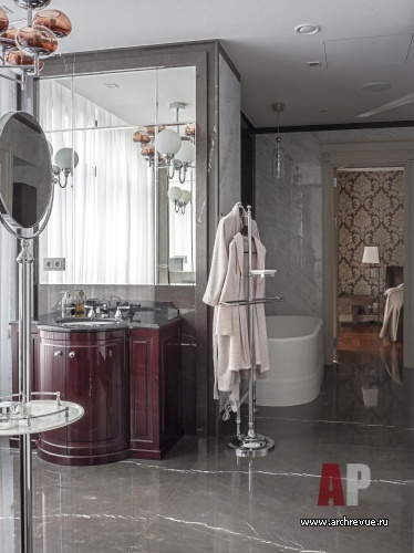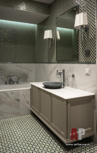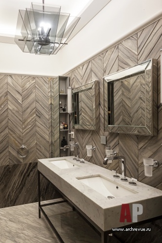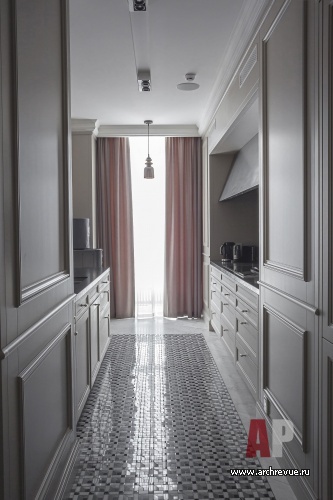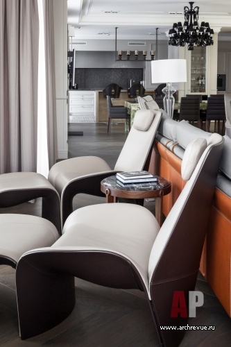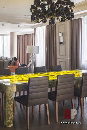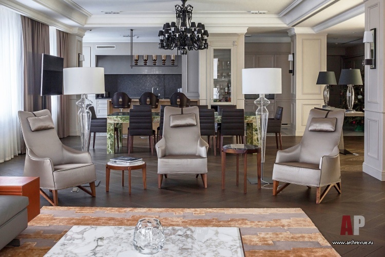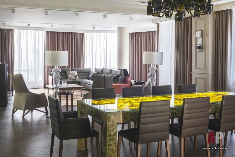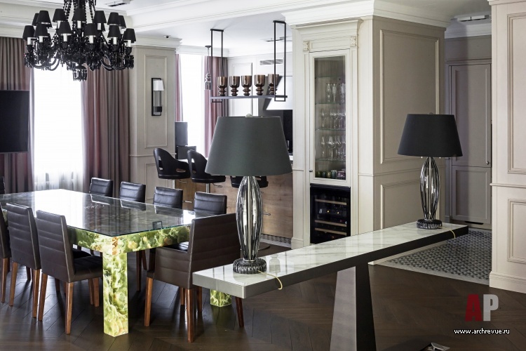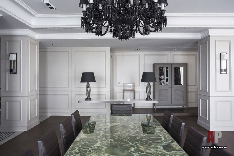 Продолжением этого ряда воспринимается черная барочная люстра по дизайну Филиппа Старка и каменные мозаичные полы. Наполнение интерьера при этом радикально современное – основу составляет актуальная мебель ведущих европейских фабрик. Важную роль в интерьере играет камень. Мрамор для отделки полов мокрых зон, санузлов и кухонного фартука архитекторы вместе с заказчиками выбирали в Италии, роскошный зеленый оникс, которым облицован обеденный стол, удалось найти в Москве. Столярные изделия (стеновые панели и встроенную мебель в гостиной, двери, резные порталы) также изготовила столичная компания. За основу цветового решения был взят оттенок кухонного гарнитура SieMatic.