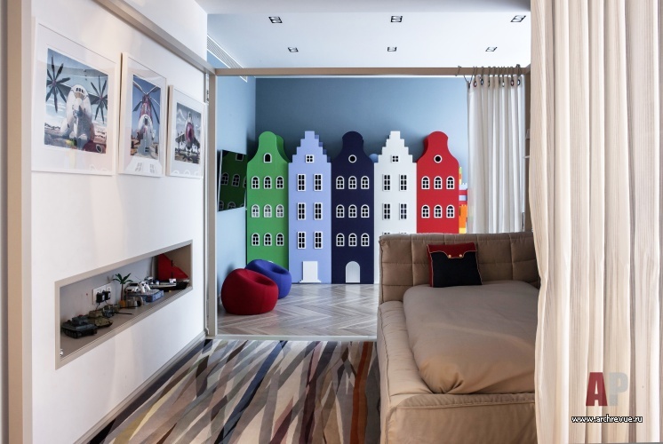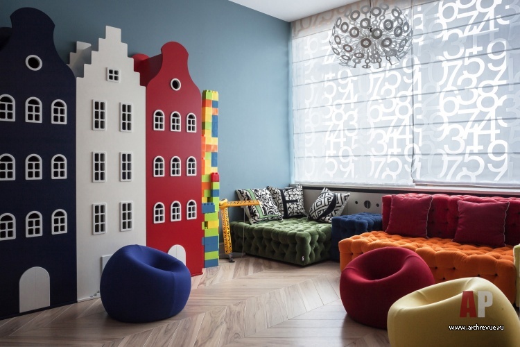 Игровая домики-шкафы Kast van een Huis, диван Meritalia, пуфы B&B Italia