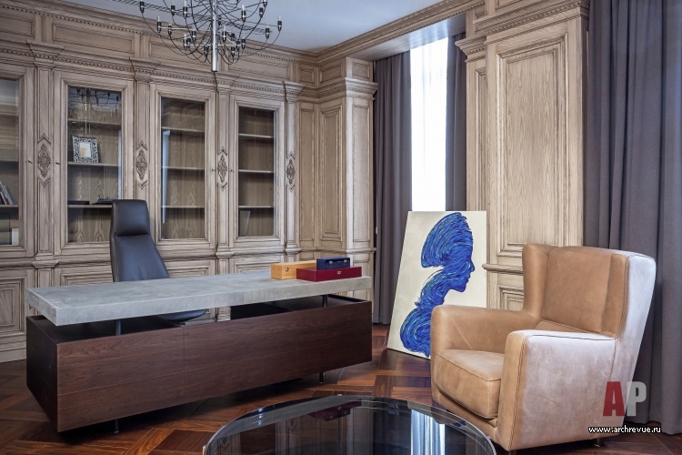 Кабинет книжный шкаф, витрины, буазери Luciano Zonta, поставщик IDC Collection; письменный стол, кресла, диваны Baxter