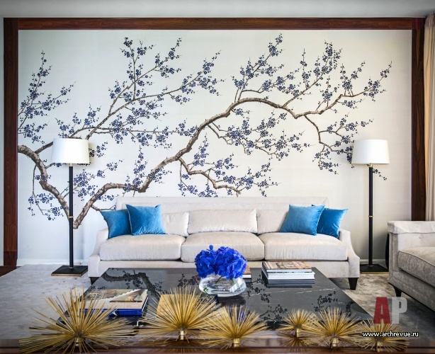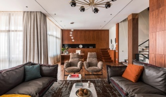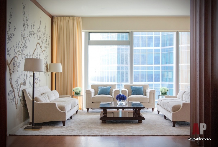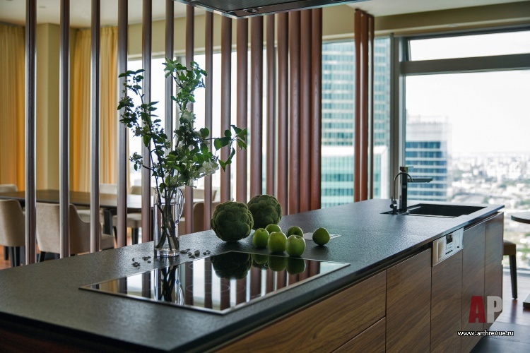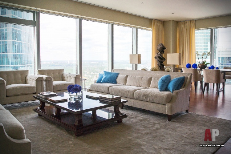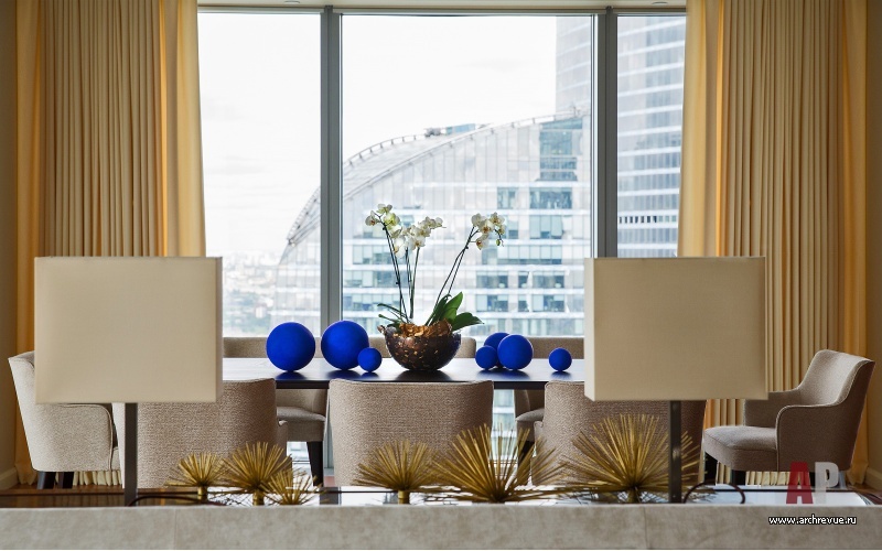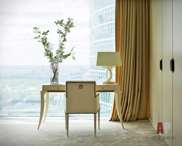 При всей простоте и лаконичности декоративных решений шпон палисандра и ореха, кожа, замша, текстиль из шелка и шерсти, бумажные обои с ручной вышивкой, светлая цветовая гамма и прекрасные перспективы Москвы создают образ европейского жилья премиального уровня.