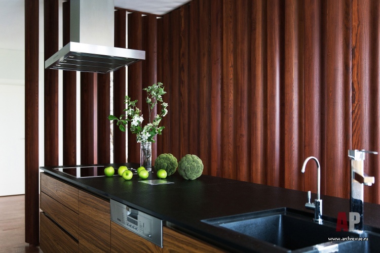 Единственной проблемой была кухня, расположенная аккуратно по центру представительской зоны. Чтобы ее обособить и сделать акцент на мягкую зону и парадную столовую группу, дизайнер спроектировала декоративную перегородку из вертикальных вращающихся ламелей. Благодаря ей удалось скрыть кухню от глаз входящих гостей и при этом зрительно не перегрузить и не утяжелить пространство.