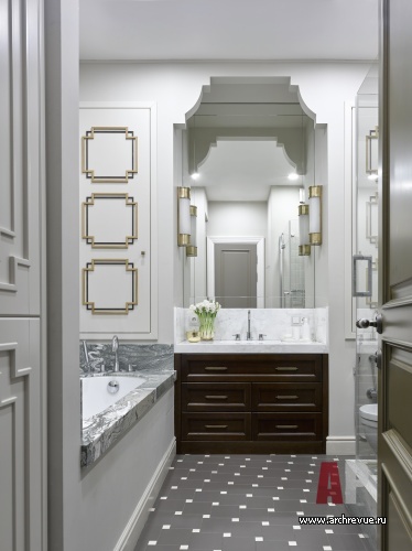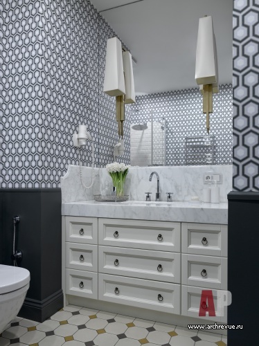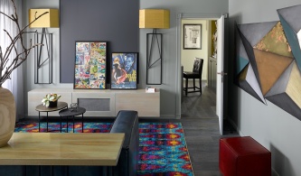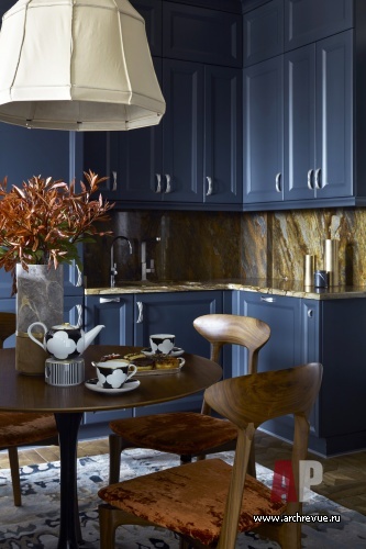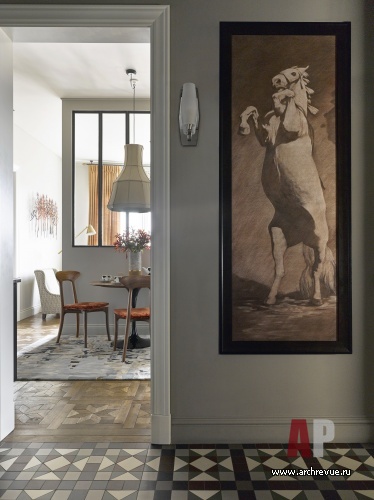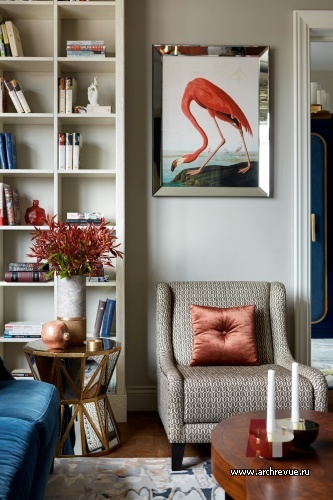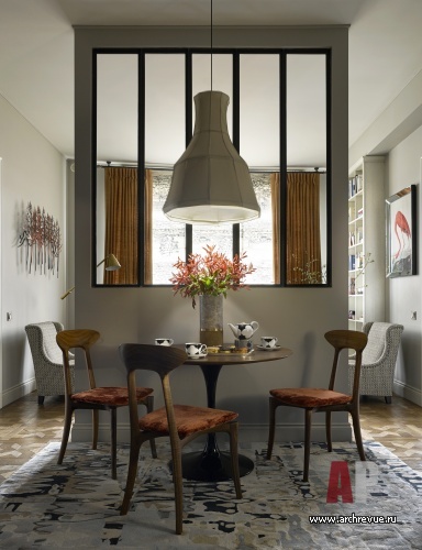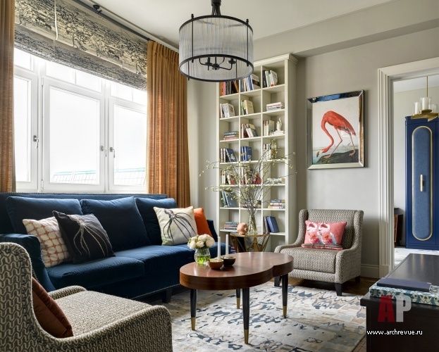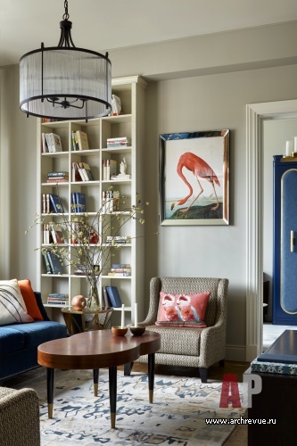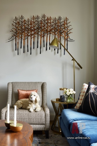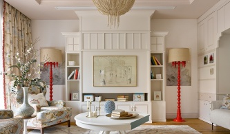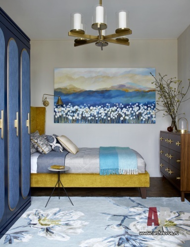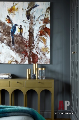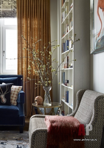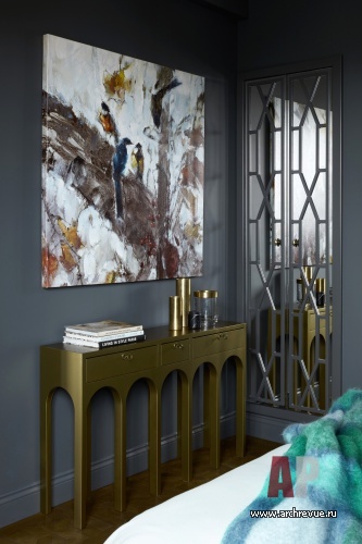 Значительная часть мебели выполнена на заказ по эскизам дизайнера, образ завершают картины современных художников и ковры в стиле фьюжн.