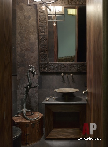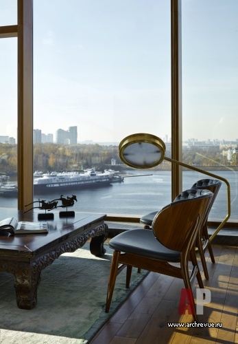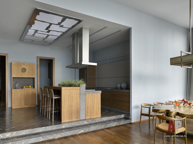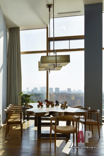 Значительную часть мебели заказчики приобрели сами в Китае (высылали фотографии понравившихся предметов Ольге и, получив одобрение, приобретали их), ряд предметов привезли из предыдущей квартиры. Например, стулья, сгруппировавшиеся вокруг стола, столешницей которого послужил огромный спил дерева, купленный на Бали. Но большая часть изделий была спроектирована в индивидуальном порядке, под проект и изготовлена российскими мастерами. Помимо декоративного решения важную роль в квартире играет техническое наполнение. Чтобы охлаждать прогреваемые солнцем помещения стеклянного объема, архитектор заложила в проект мощную систему вентиляции и кондиционирования, а также оснастила окна системой блэк-аут с электроприводом. Сами окна она также облагородила, скрыв неэстетичный алюминиевый профиль за деревянными накладками.