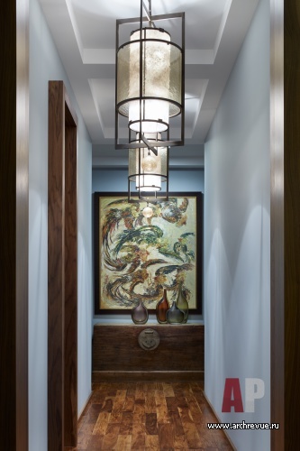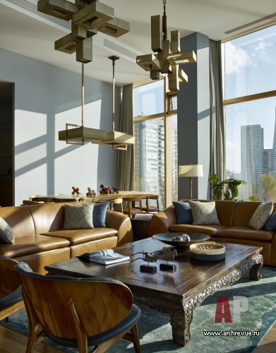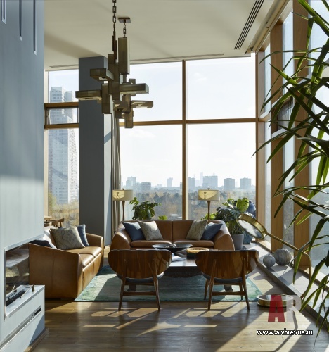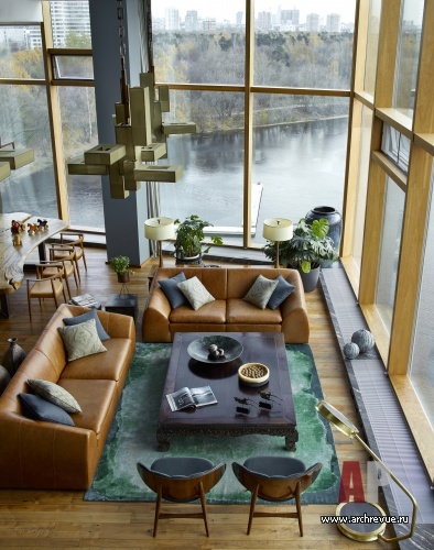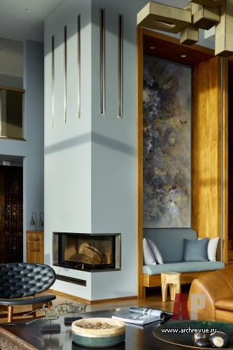 Поэтому работа над проектом началась с глобальной реконструкции и разработки новой планировки. Высота потолков в самой высокой точке квартиры достигает пяти с половиной метров, что позволило надстроить антресоли, превратив квартиру в двухэтажную и увеличить жилую площадь с 450 до 600 кв. м. На первом уровне разместилась общая гостиная со вторым светом, к ней примыкают спальни. Чтобы визуально приподнять потолки в приватных помещениях, архитектор полностью отказалась от верхнего света в пользу бокового. Над приватным блоком на пристроенной территории разместился зал для йоги и домашний кинозал. Из квартиры есть выход на крышу, где находится собственная летняя веранда.