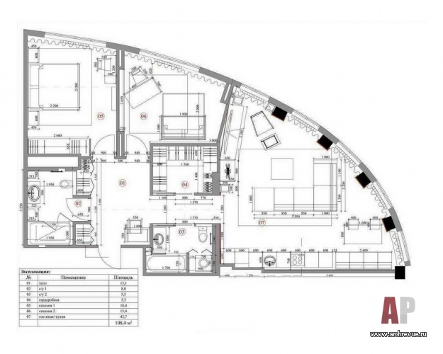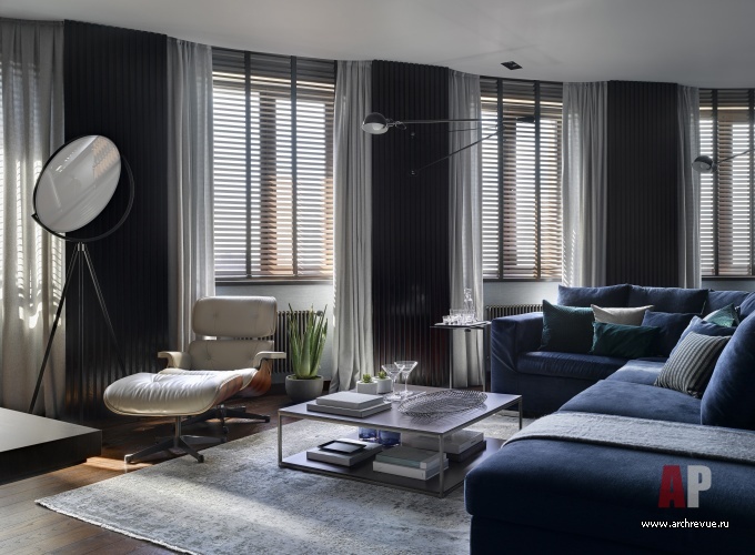 Расположенная в современном жилом комплексе квартира площадью 108 кв. м изначально имела сложную конфигурацию: фасадная стена радиусной формы, окна по одной стороне при довольно большой глубине пространства, не самое удачное расположение несущих элементов диктовали свои строгие условия.