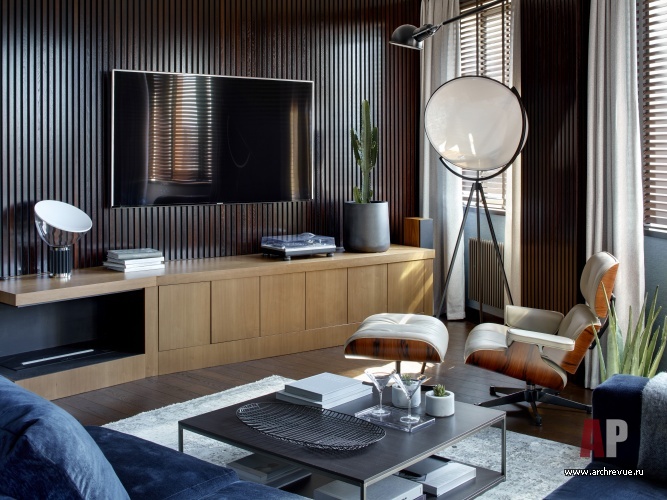 Лаконичные деревянные изделия придают интерьеру сдержанный, мужской облик, и в то же время за счет природной фактуры наполняют его теплом, домашним уютом. Этой же цели служат и другие декоративные элементы: текстильные обои, замшевые панели, обивки из натуральных тканей – приятные на ощупь, тактильные, материалы создают интерьер, в котором так приятно расслабиться и забыть о бешеном ритме мегаполиса.