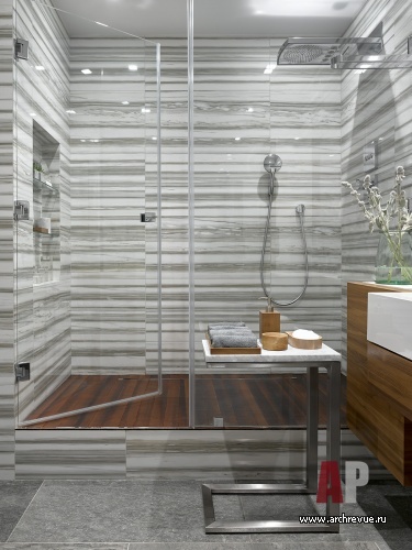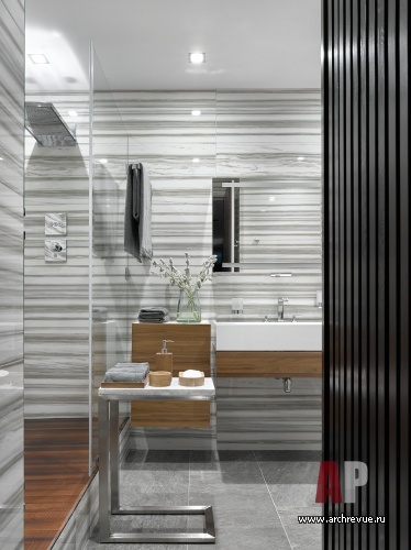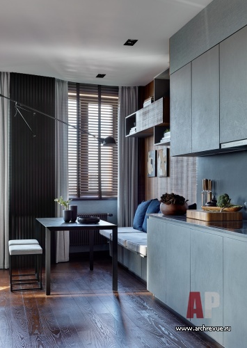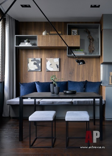 Интерьер выполнен в современной стилистике, за основу взята нейтральная цветовая гамма: прохладная серо-синяя, которая сочетается с цветом темного, словно просмоленного дерева… Дерева в интерьере много: двери, стеновые реечные панели, жалюзи, подвесные консоли, массивная доска из тика под маслом в отделке пола отсылают к дизайну комфортабельной яхты.
