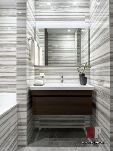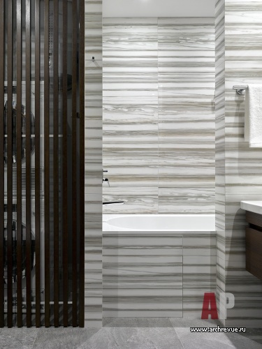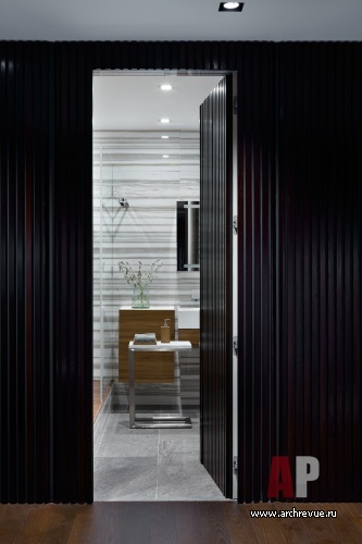При этом пожелания у заказчика были предельно конкретные: общая большая гостиная, две изолированные спальни, два санузла, отдельная гардеробная, удобная входная группа… «Планировка родилась быстро, но на ее согласование в жилищных инстанциях потребовалось время, - рассказывает Анастасия Рыкова. – Мы получили два отказа, но предложенное нами решение настолько понравилось заказчику, что он продолжил «хождение по инстанциям». С третьей попытки, благодаря его настойчивости, планировку утвердили, и начались строительные работы. В целом, нам удалось воплотить в жизнь все идеи заказчика, кроме, пожалуй, одной: расположение вентиляционной шахты не позволило сделать вход в хозяйскую ванную комнату из спальни. Мы сделали его из общего холла и замаскировали стеновыми панелями».