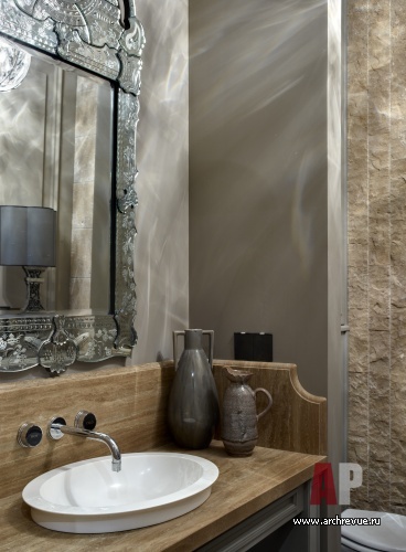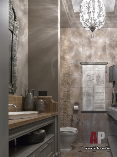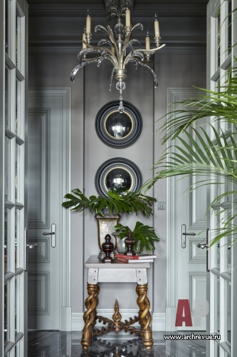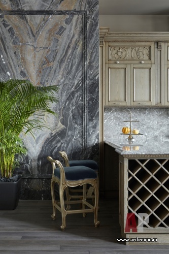 Облик интерьера общественной части во многом определил дизайн кухонного гарнитура Bizzotto, светлые фасады которого украшены резными пилястрами и медальонами. В поддержку к нему российские мастера исполнили стеновые панели и встроенные шкафы, которыми оформлена противоположная кухне стена гостиной, а также прихожая. Необарочная мебель, венецианские светильники и зеркала, черный лепной портал камина, завершают парадный образ гостиной. В спальне было решено поиграть с цветом и контрастом: добавить королевский пурпурный в обивке стеновых панелей и текстиле, обшить стены темным деревом. В ванных, напротив, ставка сделана на изысканную светлую, почти однотонную гамму.