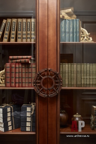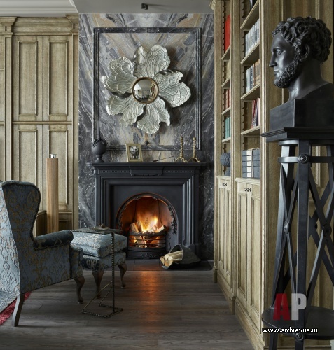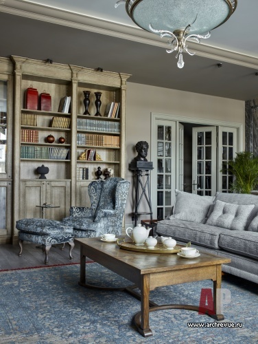 Гостиная комод, журнальные столики Jonathan Charles, диван Duresta; библиотека, шкафы, на заказ, изготовление «Мастерская Артема Степаняна»
