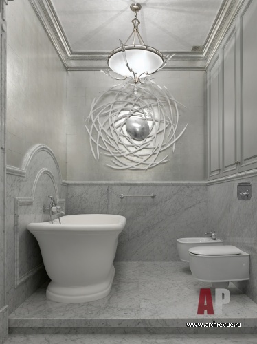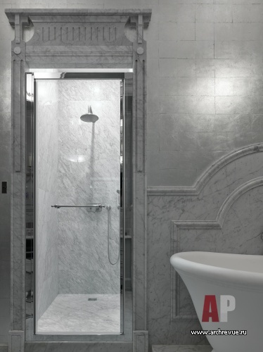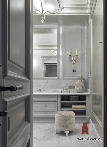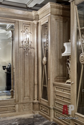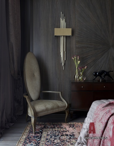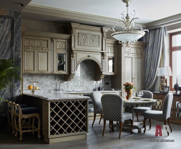 В ней дизайнер разместила все необходимые для семейного комфорта зоны: диванную группу, библиотеку, мягкую зону у камина, места для парадных обедов и быстрых перекусов с видом на столичные «открыточные» перспективы… Спальни со своими ванными комнатами и гардеробными составляют приватный изолированный блок. Удобство проживания обеспечивают потайные кладовые и встроенные гардеробные, замаскированные под классические деревянные буазери.