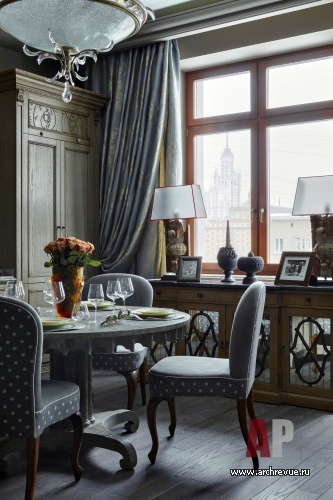 Квартира площадью 140 кв. м расположена в центре Москвы, из ее окон открывается прекрасный вид на историческую часть города и одну из столичных высоток. Именно локейшн во многом и определил стилистику интерьера: подробного и аристократичного. Семейная пара с детьми обратилась к дизайнеру Ольге Сурковой с пожеланием спроектировать парадный неоклассический интерьер с благородными материалами.