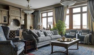 В поисках аутентичных изделий, дизайнеры познакомились с прекрасными калужскими мастерами, которые сделали резные деревянные панно в обрамлении печи. Сама керамическая облицовка печи также авторская, она исполнена по аналогии со старинными русскими изразцами. В небольшой мастерской были изготовлены стеклянные изделия, а также предметы из металла… Но назвать дом в чистом виде русским нельзя, опытный глаз увидит в нем банкетки Zara Home, французские скатерти, бельгийские ковры. Так что, взяв за основу приметы русского деревенского стиля, дизайнеры создали колоритный интернациональный микс: по-настоящему уютный и гостеприимный.