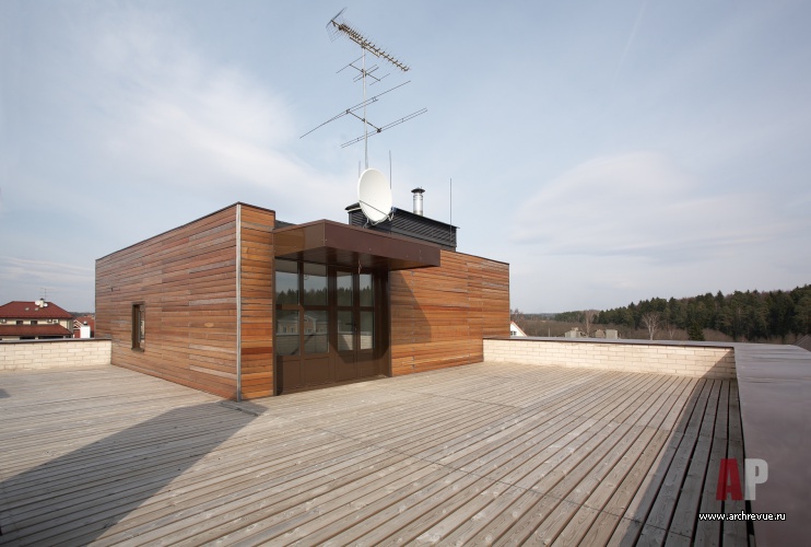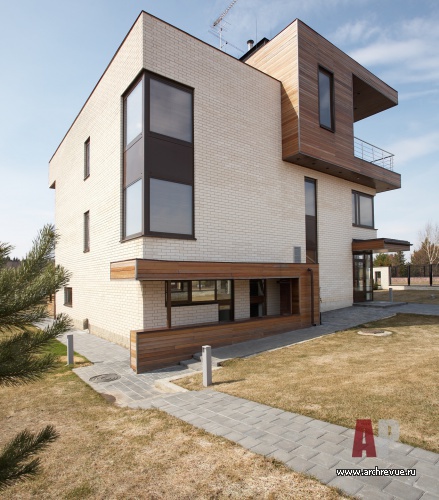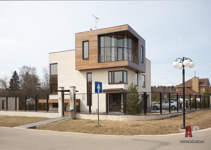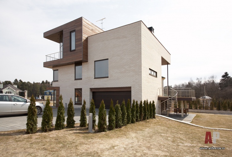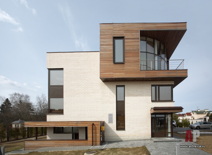 Это позволило сделать композицию дома с угловым выступающим элементом, выходящим на оба фасада. Здание облицовано белым финским кирпичом и натуральным деревом. Дом выглядит компактным: при общей площади дома в 360 кв. м площадь застройки составляет 191 кв. м. Облик дома формируют две открытые террасы (одну на крыше, другую – с выходом в сад из гостиной), а участка – теннисная площадка под навесом и беседка.