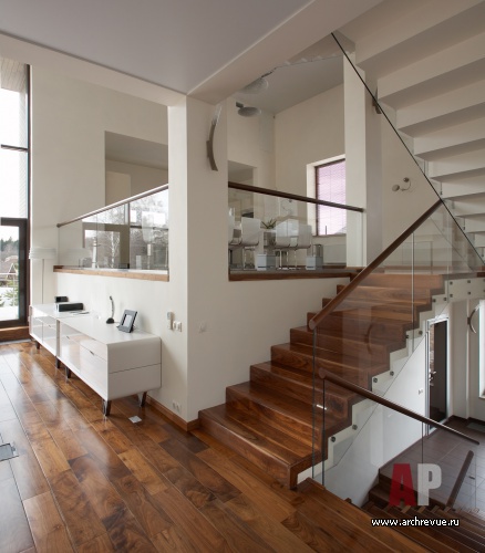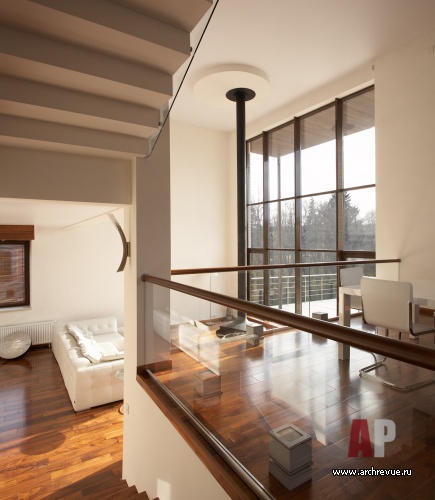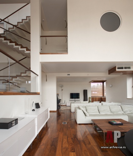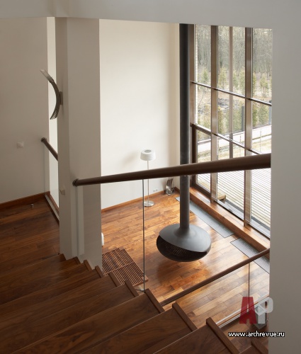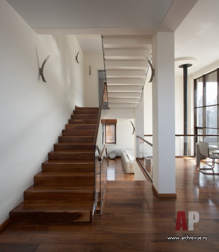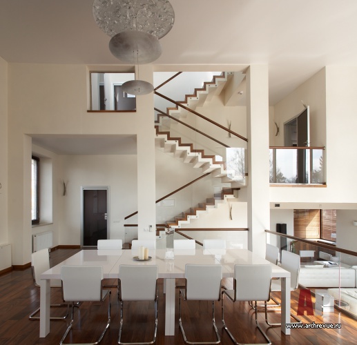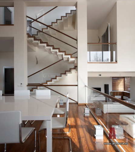 Системой отсчета для интерьеров этого дома является лестница. Помещения в доме находятся на подуровнях: этот прием позволяет создать внутри дома пространства различной высоты: одно-, полутора- и двусветные, что очень важно особенно для небольшого дома.