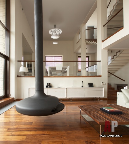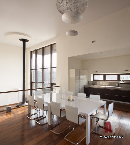Самое высокое помещение в доме – гостиная с камином, объединенная с зоной домашнего кинотеатра. Лестничным пролетом выше, словно на балконе, находится кухня-столовая. Еще выше – приватные помещения, где также прослеживается принцип максимальной открытости и функционального сближения разных по назначению зон.